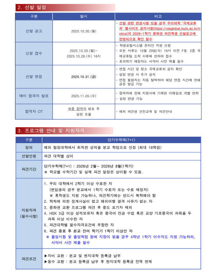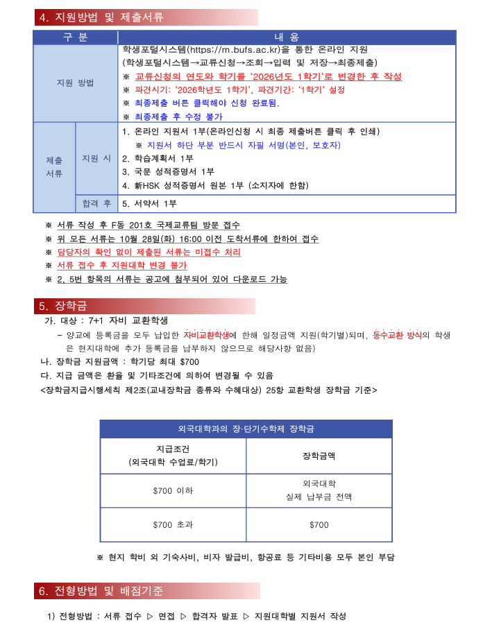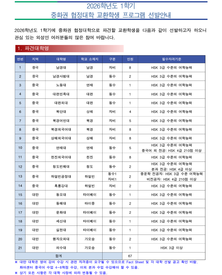 NOTICE Outgoing 2026학년도 1학기 중화권 협정대학 파견 교환학생 선발 공고 및 안내 2026-1학기 중화권 대학별 지원자격 및 세부조건.pdf(105.8K)[본문2] 대만 파견대학 Fact Sheet.zip(9.5M)학습계획서 양식.hwp(32.5K)서약서 양식.hwp(112.0K) 부산외국어대학교4일 전조회수176 목록2026학년도 1학기 영어권 해외…