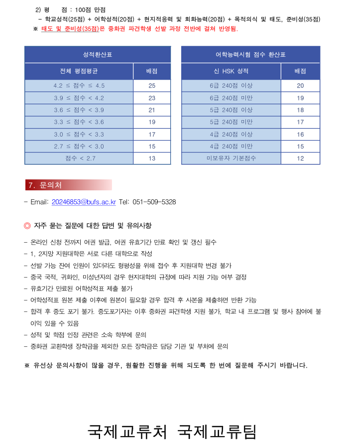NOTICE Outgoing 2026학년도 1학기 중화권 협정대학 파견 교환학생 선발 공고 및 안내 2026-1학기 중화권 대학별 지원자격 및 세부조건.pdf(105.8K)대만 파견대학 Fact Sheet.zip(9.5M)학습계획서 양식.hwp(32.5K)서약서 양식.hwp(112.0K) 목적의식(20점) -> 현지적응력 및 회화능력(20점) 부산외국어대학교2025. 10. 20조회수289 목록2026학년도 1학기 영어권 해외…