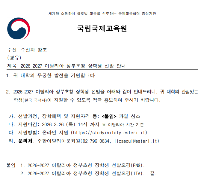 NOTICE Events&Jobs 이탈리아 정부초청 장학생 선발 안내 2026-2027 이탈리아 정부초청 장학생 선발 안내.hwp(106.0K)2026-2027 이탈리아 정부초청 장학생 선발요강ENG.pdf(678.8K)2026-2027 이탈리아 정부초청 장학생 선발요강ITA.pdf(438.5K) 부산외국어대학교1일 전조회수125 목록SAP & 영어권 장단기 파견 설…